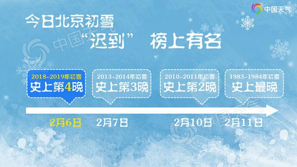 昨天早晨,受高空短波槽及底層東風影響,北京北部和西部多個站點出現飄雪,達到了初雪的標準。從歷史數據來看,1951年以來,北京最晚初雪日分別出現在1983-1984年冬季的2月11日,2010-2011年冬季的2月10日,2013-2014年冬季的2月7日,2019年2月6日出現的初雪位居第四位。