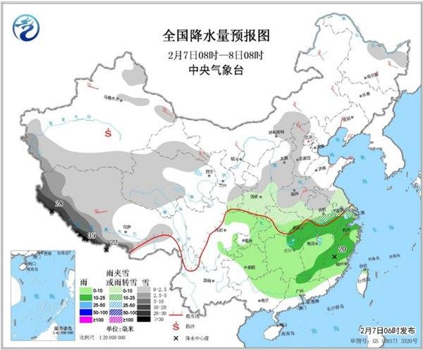 中央氣象臺預計,2月7日08時至8日08時,新疆沿天山地區和南疆盆地南部、青海中西部、西藏西部和南部、西北地區東部、華北北部和南部、黃淮西部、江淮、江漢中北部等地部分地區有小到中雪或雨夾雪,其中,西藏南部和西部部分地區有大到暴雪,局地有大暴雪或特大暴雪(30~35毫米)。江漢南部、江南、西南地區東部、華南北部和臺灣島等地部分地區有小雨,其中,安徽中南部、湖北東部和南部、湖南北部、江西中北部和南部、浙江大部、福建北部和廣東北部等地部分地區有中雨。新疆北部、甘肅中部、內蒙古西部和中東部、東北地區大部、河北北部、黃淮、江南中東部等地部分地區有4~6級及以上風。渤海、渤海海峽、臺灣海峽將有7級、陣風8級的東北風,黃海大部、東海大部將有8級、陣風9~10級的偏北風或東北風。