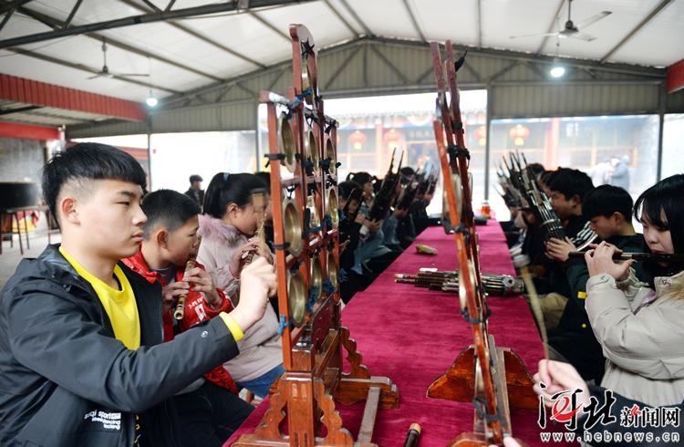 當天演奏隊伍40人中,近30人是在校的中小學生,外圍仍有20多名學生觀演。“去年春天招收學員時一下子來了60多人,經過一段時間實際練習,最終留下了十幾人,再加上前兩年招收的學員,目前有學生學員50多人。”資深樂師夏國明介紹說,村里自古有演奏音樂會的傳統,代代相傳,很多人都會哼一段小曲。雄安新區設立后,傳統文化備受重視,中央音樂學院、河北大學等高校的教授前來考察并錄制整理,因此更增加了當地人的文化自豪感,一些家長也踴躍讓孩子課余時間學習演奏。
