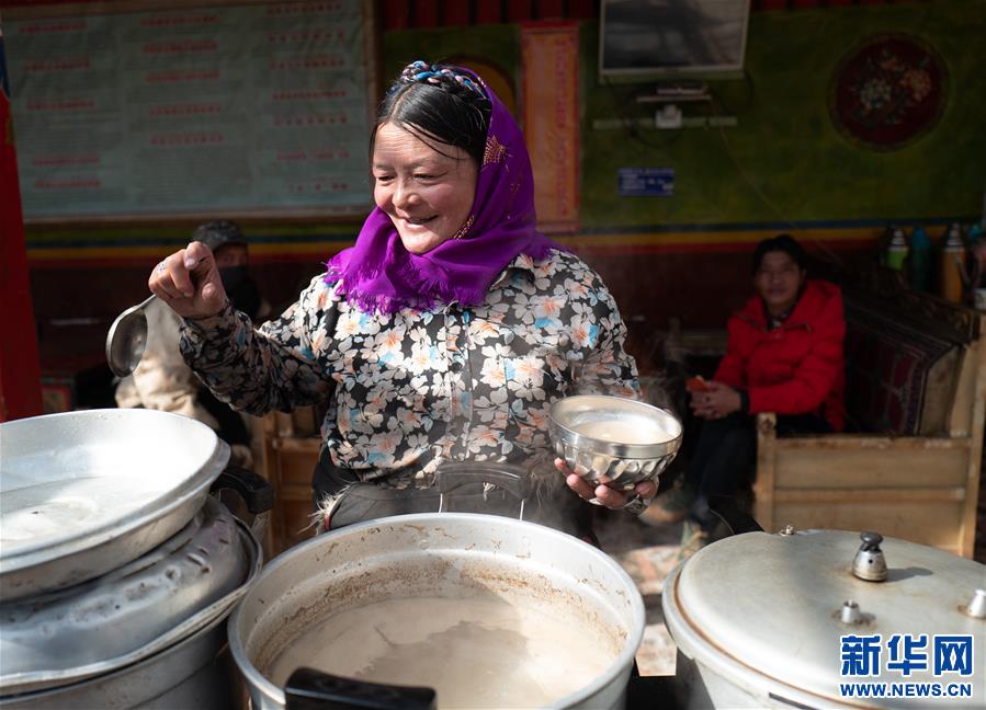 雙湖縣嘎措鄉牧民貢桑曲珍在餐館里為客人盛飯(1月31日攝)。新華社記者 普布扎西 攝