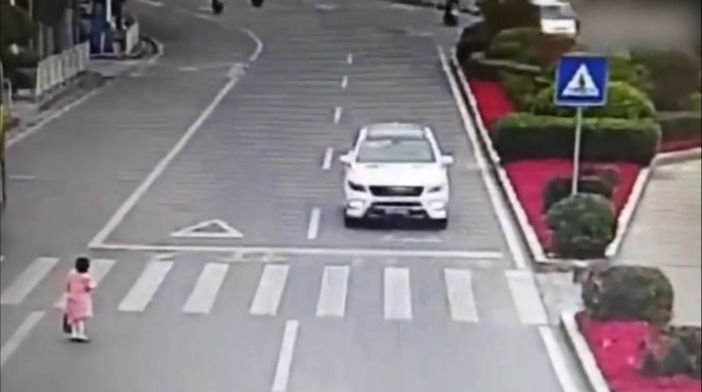 2月5日,廣東潮州,回家過年的林先生開車時,一個小女孩正準備經過人行道。小女孩看到車駛過來,停下了腳步,林先生也隨即減速、停車,禮讓小女孩先過。