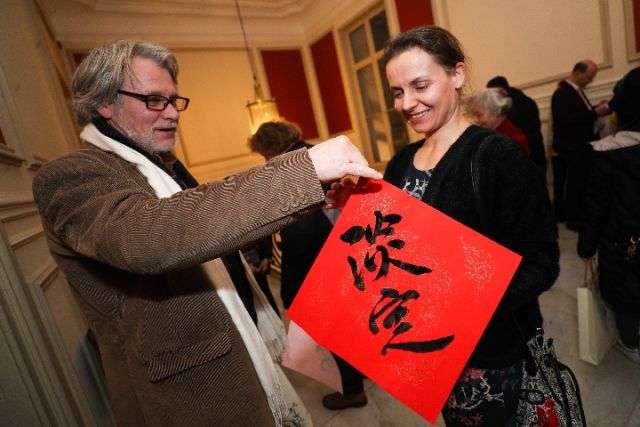 2019年2月4日,來自歐洲國家的各界人士以及在比利時的華僑華人走進布魯塞爾中國文化中心,共同慶祝中國傳統佳節——春節。圖為參觀者在比利時布魯塞爾的中國文化中心展示得到的漢字書法禮物。(新華社記者鄭煥松攝)