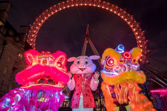圖為2019年2月4日晚,在英國倫敦,演員們在亮起紅色燈光的“倫敦眼”前合影。(新華社發)