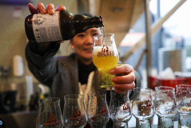 圖為2019年2月6日,在比利時弗蘭德斯大區科特賴克,比利時“鳳凰”精釀啤酒廠老板娘王敏展示她的釀酒廠生產的啤酒。(新華社記者鄭煥松攝)