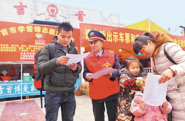 今年78歲的王源孝(左二)是廣鐵集團張家界車務段吉首火車站退休職工,現為張家界車務段退管黨支部書記。2001年退休以后,他帶領老年志愿者服務隊,連續18個春運堅守在吉首火車站廣場,為旅客做好事2萬余件,獲得獎項達150多項。他把獲得的獎金全部用于慈善事業。圖為2月9日,王源孝為旅客提供列車時刻信息服務。姚博然攝(中經視覺)