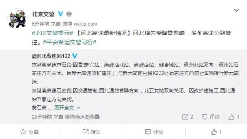 “北京交警”官方微博也發布提示,受降雪影響,京滬高速大羊坊出京方向、京津高速臺湖出京方向,采取封閉措施,請注意繞行。此外,河北境內受降雪影響,多條高速公路受到雙向封閉等管控措施。