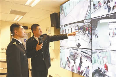 趙毓偉(右)和同事在視頻監(jiān)控中發(fā)現(xiàn)一個可疑情況。