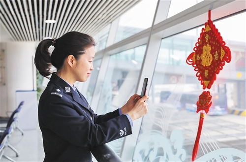 2月6日,青島機場出入境邊防檢查站女子旅檢科民警馮哲利用工作間隙與遠在老家的兒子視頻通話。解 豪攝(新華社發)