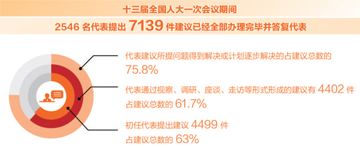“十三屆全國人大一次會議期間,代表們認真履行憲法和法律賦予的職責,向大會提出建議7139件。建議內容聚焦打好三大攻堅戰、實施鄉村振興戰略、推動經濟高質量發展、保障和改善民生等方面。”在2018年12月召開的十三屆全國人大常委會第七次會議上,全國人大常委會副秘書長信春鷹報告了第十三屆全國人民代表大會第一次會議代表建議、批評和意見的辦理情況。信春鷹表示,截至2018年12月,7139件代表建議已經全部辦理完畢并答復代表,代表建議所提問題得到解決或計劃逐步解決的占建議總數的75.8%。