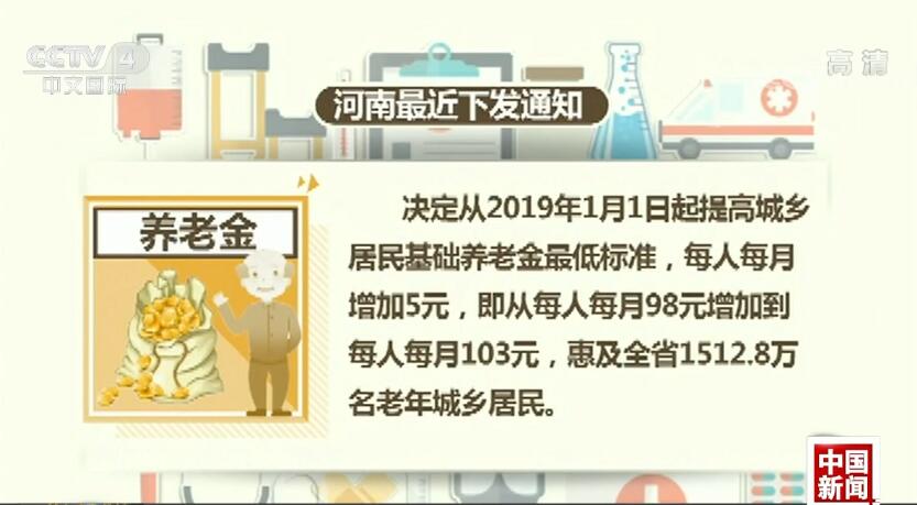 河南最近下發通知,決定從2019年1月1日起提高城鄉居民基礎養老金最低標準,每人每月增加5元,即從每人每月98元增加到每人每月103元,惠及全省1512.8萬名老年城鄉居民。