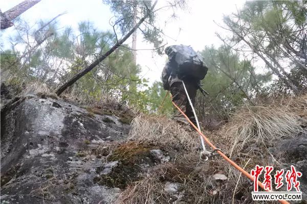 官兵利用攀登繩攀爬“絕望坡”。
