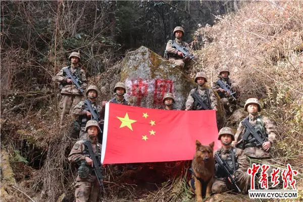 山上風(fēng)大雪大,原來的標(biāo)志已經(jīng)有些模糊不清。中士賀鋼拿出一大桶紅色油漆,用刷子重新寫下了兩個鮮紅的大字——“中國”。排長頓珠從挎包里拿出國旗,官兵們托起五星紅旗,站在山巔舉起右手宣誓:“我的腳印是界碑,我站立的地方是中國!”