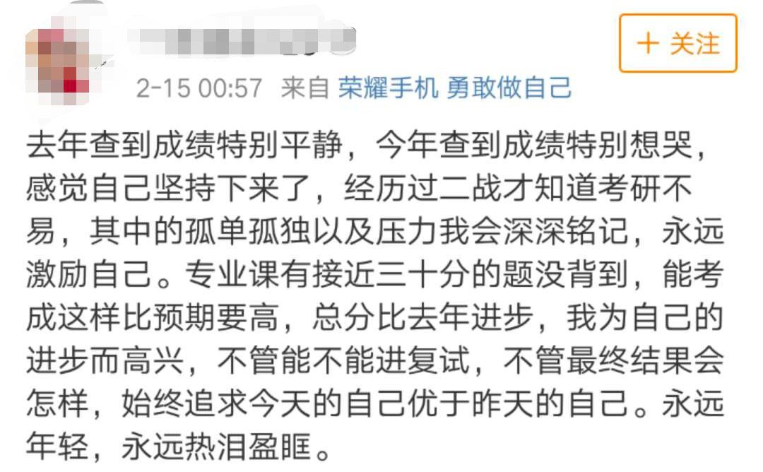 還有“二戰”的考生深知考研的不易,去年查成績很平靜,今年卻特別想哭,為自己進步而高興,無論結果如何,始終追求今天的自己優于昨天的自己↓↓↓