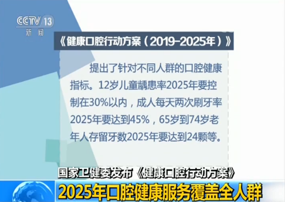 《健康口腔行動方案(2019-2025年)》提出了針對不同人群的口腔健康指標。12歲兒童齲患率2025年要控制在30%以內,成人每天兩次刷牙率2025年要達到45%,65歲到74歲老年人存留牙數2025年要達到24顆等。