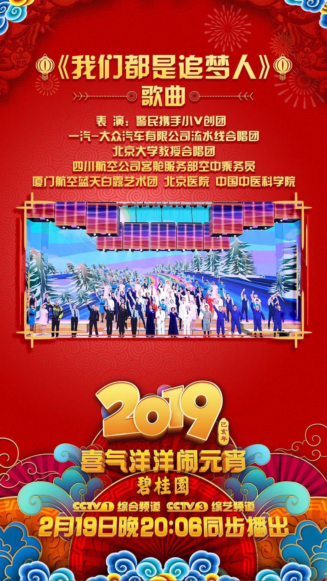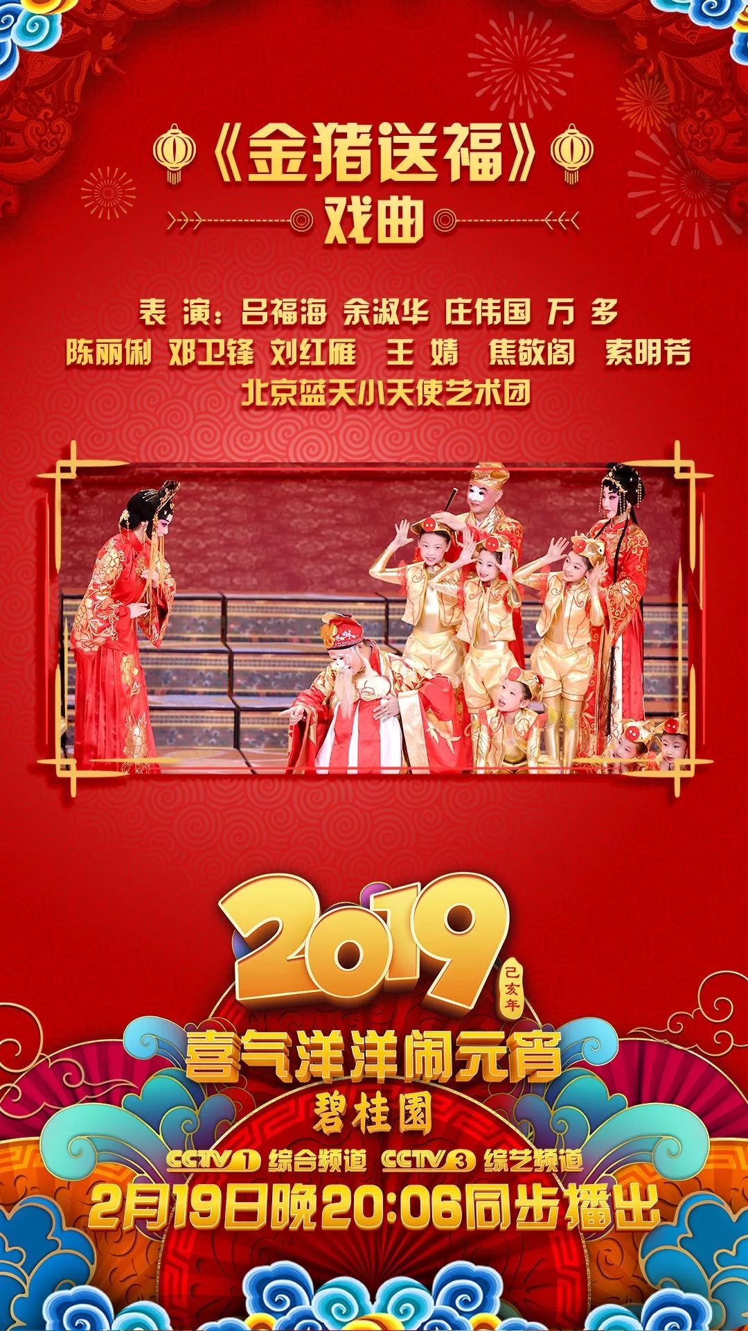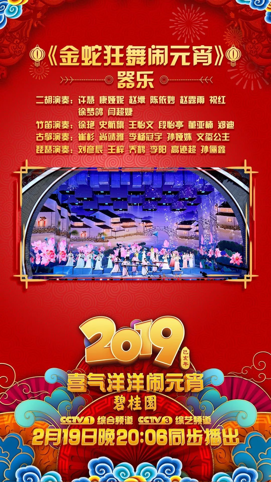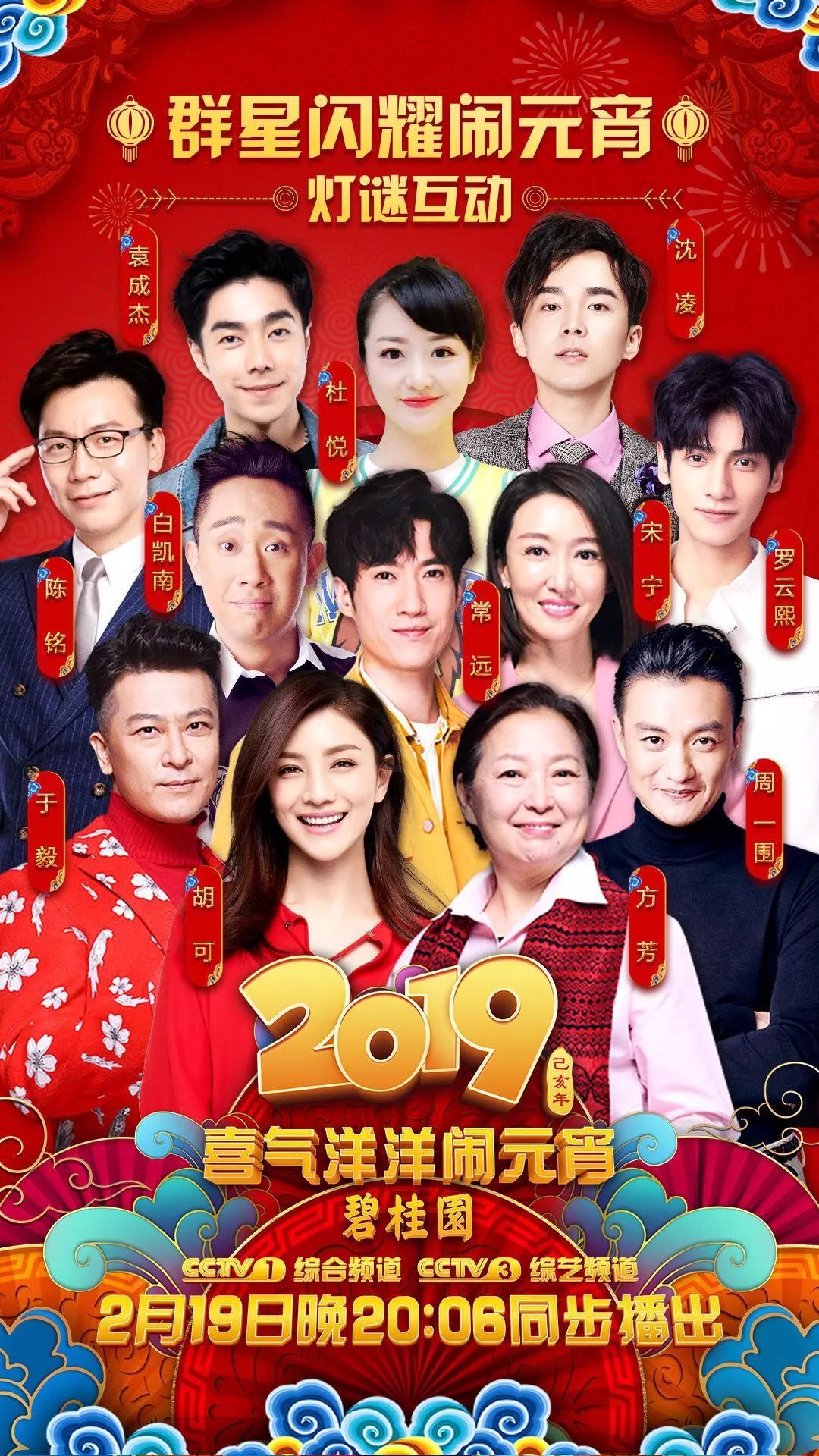 中央廣播電視總臺《2019年元宵晚會》將在元宵節2月19日當晚20:06 CCTV-1綜合頻道、CCTV-3綜藝頻道絢麗登場。整臺晚會以“金豬鬧春”為主題,“鬧”與“樂”成為兩大關鍵詞,將圍繞傳統文化、藝術表演、聯歡特色三大主線展開,陪伴全國觀眾共度元宵佳節。究竟有哪些藝術家和演員們在元宵節為全國電視觀眾送來這場視聽盛宴呢?《2019年元宵晚會》嘉賓全陣容亮相!讓我們先睹為快!