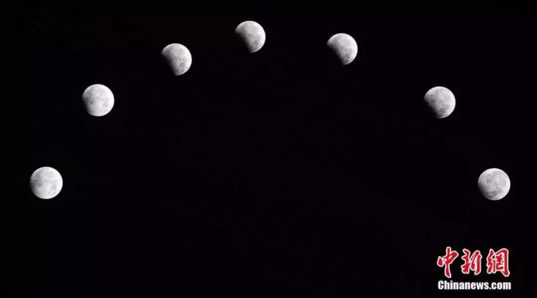 資料圖:8月8日凌晨,山西太原夜空上演月偏食天象。此次月偏食大約在1時20分出現初虧,約在2時20分進入食甚,約3時20分復圓。(多重曝光) 中新社記者 韋亮 攝