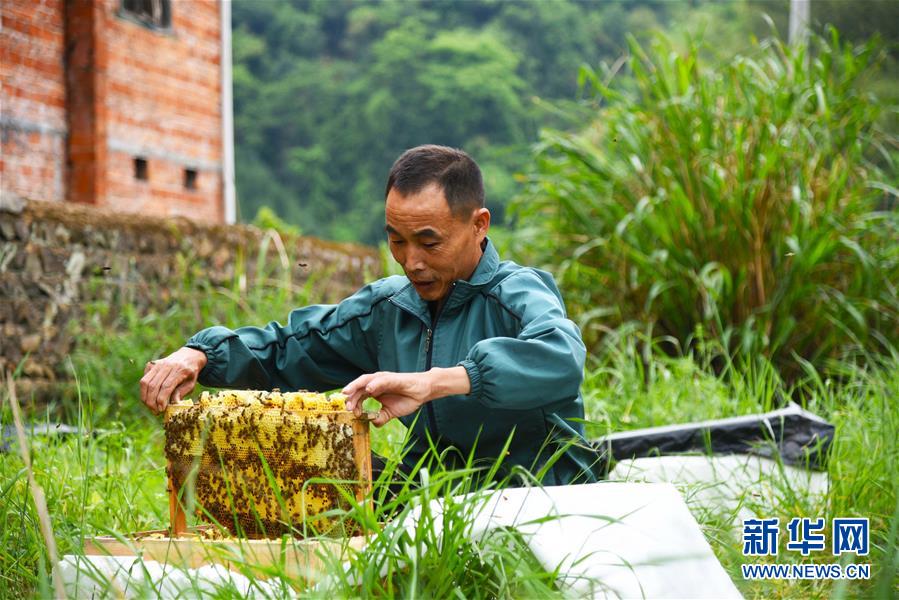 江西省贛州市贛縣區(qū)韓坊鎮(zhèn)農(nóng)民在查看蜂箱(2018年4月25日攝)。 新華社發(fā)(李明水 攝)