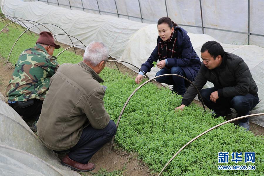 江西省贛州市贛縣區(qū)五云鎮(zhèn)黨委書記明經(jīng)華(右二)在鎮(zhèn)里的甜葉菊種植基地里調(diào)研村民生產(chǎn)情況(2月13日攝)。新華社發(fā)(張帆 攝)