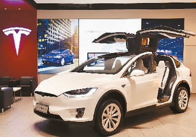位于北京CBD美國特斯拉公司中國總部展示的電動汽車。新華社記者 羅曉光攝