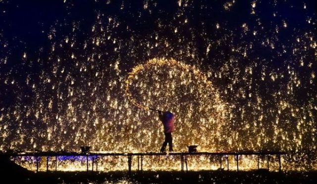 ↑2019年2月5日晚,民間藝人在河北遵化市亞太廟會(huì)上表演“打樹(shù)花”。(新華社)