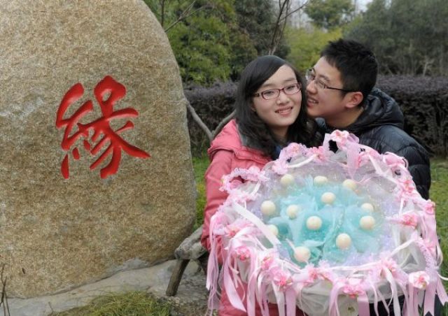 ↑2014年2月13日,南京白鷺洲公園里緣分石前上演浪漫一幕,在情人節(jié)和元宵節(jié)的前一天,一個(gè)小伙子手捧自己用糯米元宵制作的象征“實(shí)心實(shí)意、愛(ài)情圓滿”花籃,向女朋友求婚,終于收獲了女友的芳心。(視覺(jué)中國(guó))