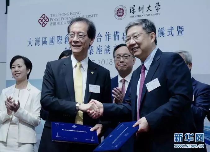 2018年7月18日,在香港理工大學,香港理工大學校長唐偉章和深圳大學校長李清泉(前右)簽署“大灣區國際創新學院”合作備忘錄后握手。新華社發(王申 攝)