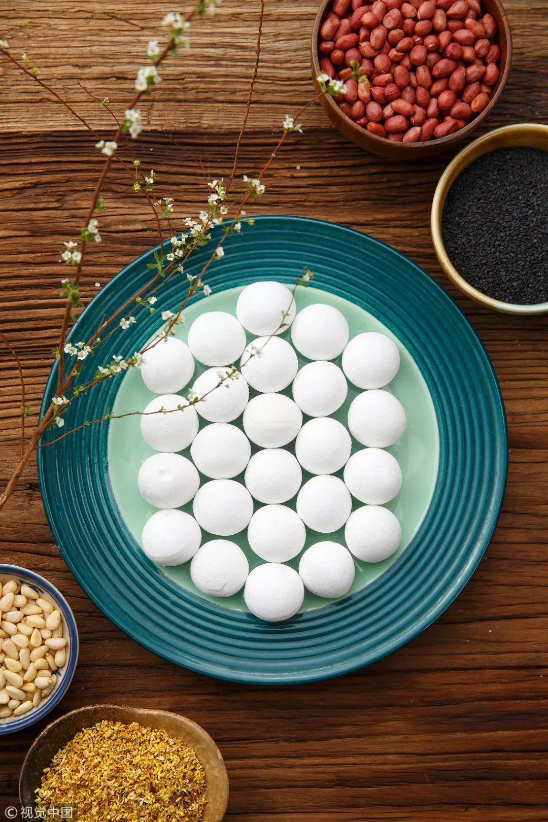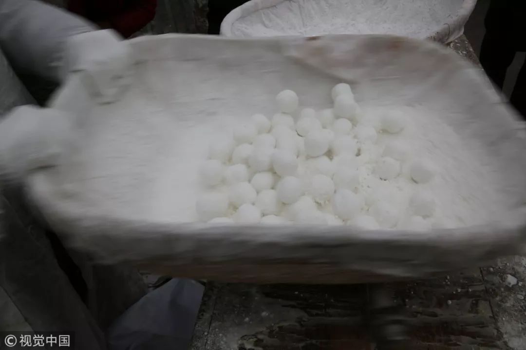把餡料蘸水投進盛滿糯米粉的笸籮內