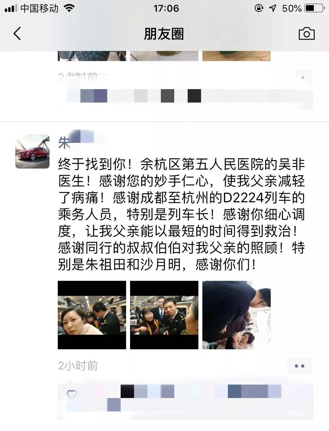 大伯的兒子朱先生在了解到列車上發(fā)生的一幕后,通過當(dāng)時(shí)親戚錄制的視頻,輾轉(zhuǎn)兩天,終于在杭州市余杭區(qū)第五人民醫(yī)院找到了D2224次列車上這名沒留名的“好心醫(yī)生”。