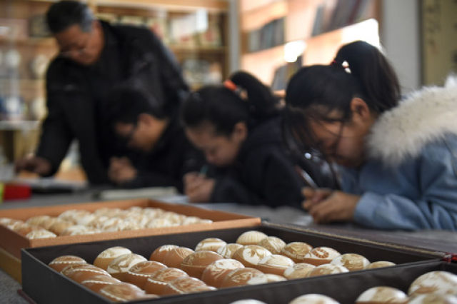 2月13日,寧夏石嘴山市惠農區南街街道礦中社區的學生們在學習蛋雕。新華社發(馮開華 攝)