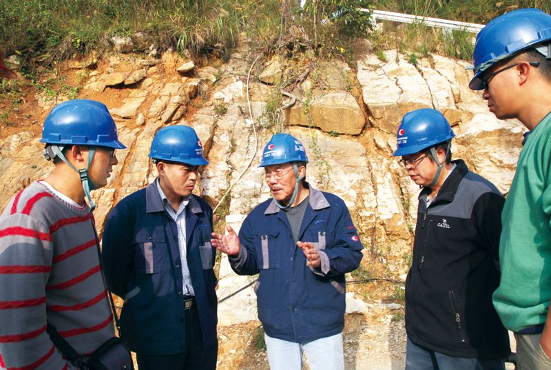 南仁東(左三)與工程技術(shù)人員在黔南州平塘縣大窩凼檢查施工進(jìn)度 新華社照片 中科院國家天文臺供圖