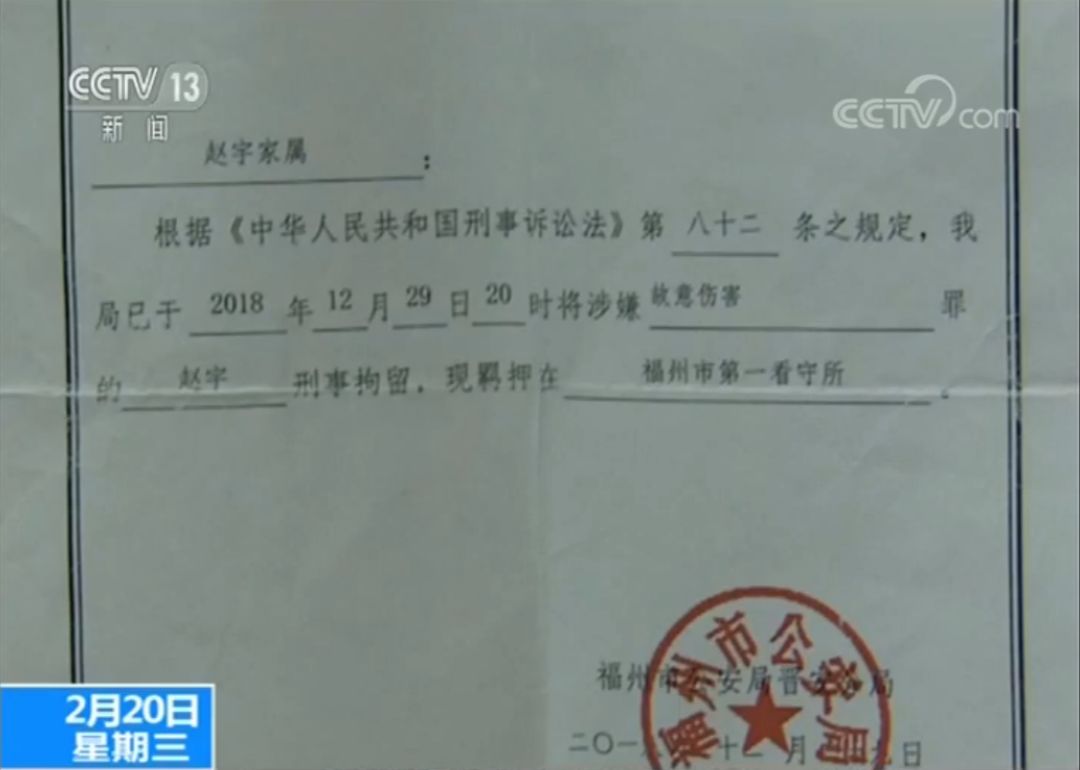 2月20日下午,福州市公安局晉安分局以過失致人重傷罪將趙宇移交晉安區人民檢察院。