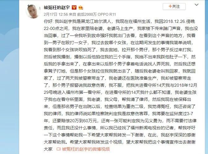 2月17日,福建福州一小伙趙宇發出求救微博,稱自己因阻止女鄰居被施暴,與施暴者產生肢體沖突,最后卻因涉嫌“故意傷害”被刑拘13天。微博發出后引發網友關注。今天凌晨,@福州公安 發布警情通報稱:晉安區人民檢察院經審查認為,趙宇行為屬正當防衛,不作起訴。雖然檢方對事件有了定性,但事情的經過究竟是什么?央視記者采訪了事件中的三位當事人。