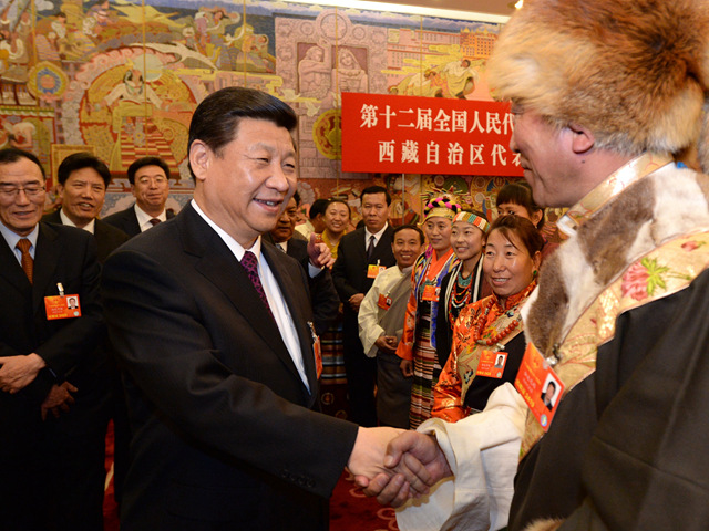 2013年3月9日,中共中央總書記、中共中央軍委主席習近平參加十二屆全國人大一次會議西藏代表團的審議。這是習近平同代表親切交談,右二為格桑卓嘎。(新華社記者 馬占成 攝)