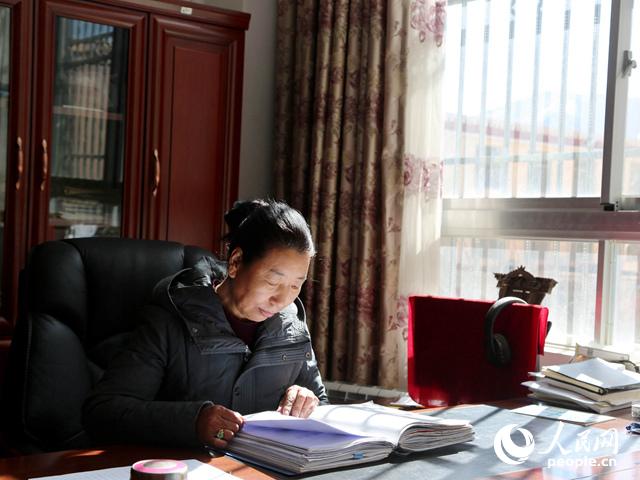格桑卓嘎在辦公室翻閱文件。 (吳雨仁 攝)
