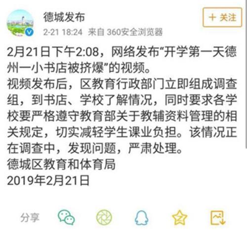 視頻發布后,區教育行政部門立即組成調查組,到書店、學校了解情況,同時要求各學校要嚴格遵守教育部關于教輔資料管理的相關規定,切實減輕學生課業負擔。該情況正在調查中,發現問題,嚴肅處理。