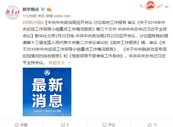 【中共中央政治局召開會議 討論政府工作報告 審議《關(guān)于2018年中央巡視工作領(lǐng)導(dǎo)小組重點工作情況報告》等三個文件 中共中央總書記習(xí)近平主持會議】新華社北京2月22日電 中共中央政治局2月22日召開會議,討論國務(wù)院擬提請第十三屆全國人民代表大會第二次會議審議的《政府工作報告》稿,審議《關(guān)于2018年中央巡視工作領(lǐng)導(dǎo)小組重點工作情況報告》、《關(guān)于中央脫貧攻堅專項巡視情況的綜合報告》和《黨政領(lǐng)導(dǎo)干部考核工作條例》。中共中央總書記習(xí)近平主持會議。