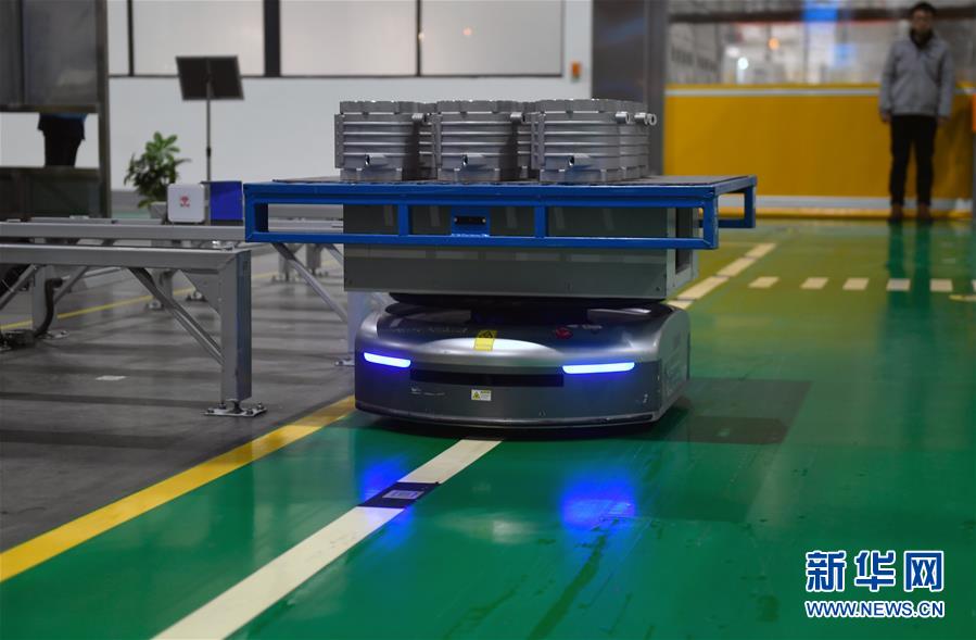 一輛智能機器人搬運車在浙江臥龍集團的自動化生產車間穿行(2月15日攝)。 新華社記者 黃宗治 攝