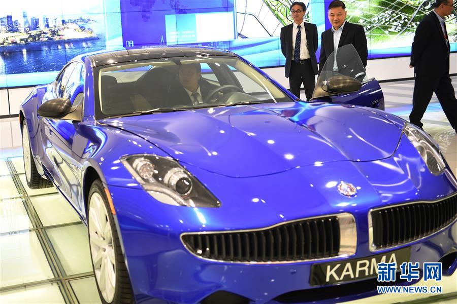 觀眾在浙江萬向集團總部大廳參觀混合動力跑車“卡瑪”,這輛跑車可以兼容燃油、電能和太陽能三種能源(2018年11月30日攝)。新華社發