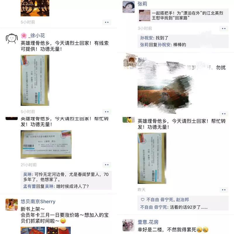 投遞業務檢查管理員孫祝安是一名退伍老兵,也是一名老黨員,在看到這封信后立即在朋友圈發出“英雄埋骨他鄉,今天請烈士回家!幫忙轉發,功德無量!”的求助帖,沒過多久,老孫朋友圈里的南京郵政全體員工都立刻自發轉發了這個求助帖,迅速得到了社會各界熱心人士的關注,紛紛在朋友圈和各種論壇上轉發,也引起了南京公安部門的重視。