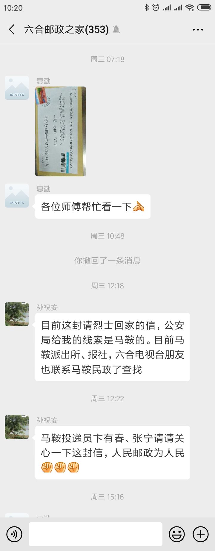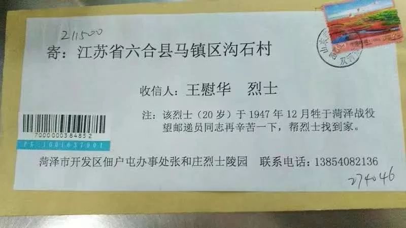 2月20日早上七點半左右,江蘇南京郵政六合區分公司雄州投遞部收到一封信件,寄往六合縣馬鎮區溝石村,收件人為“王慰華烈士”,并備注:“該烈士(20歲)于1947年12月犧牲于菏澤戰役,望郵遞員同志再辛苦一下,幫烈士找到家。”