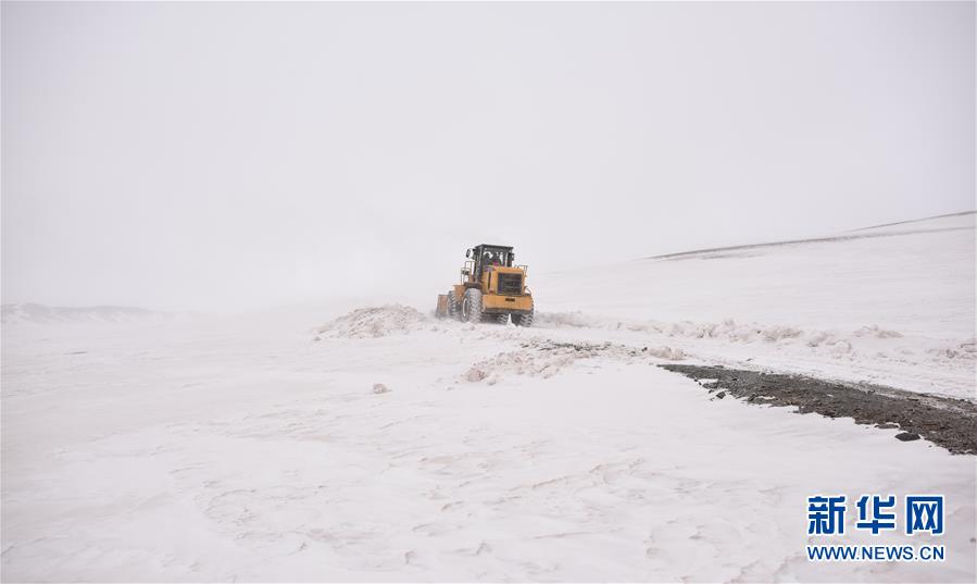 2月23日,在青海省玉樹藏族自治州稱多縣扎朵鎮(zhèn)治多村,一輛裝載機在清除路面積雪。新華社記者吳剛攝