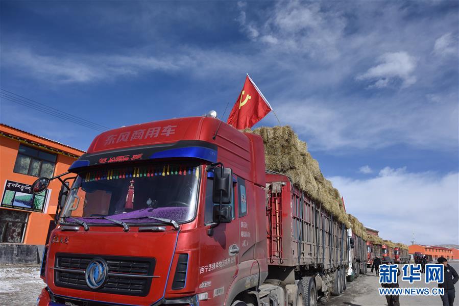 2月22日,在青海省玉樹藏族自治州稱多縣清水河鎮(zhèn),幾輛滿載飼草料的救災(zāi)卡車整裝待發(fā)。新華社記者吳剛攝