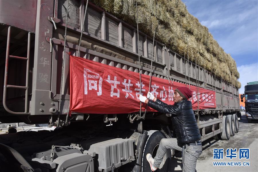 2月22日,在青海省玉樹藏族自治州稱多縣清水河鎮(zhèn),一名司機在捆綁救災(zāi)飼草料。新華社記者吳剛攝