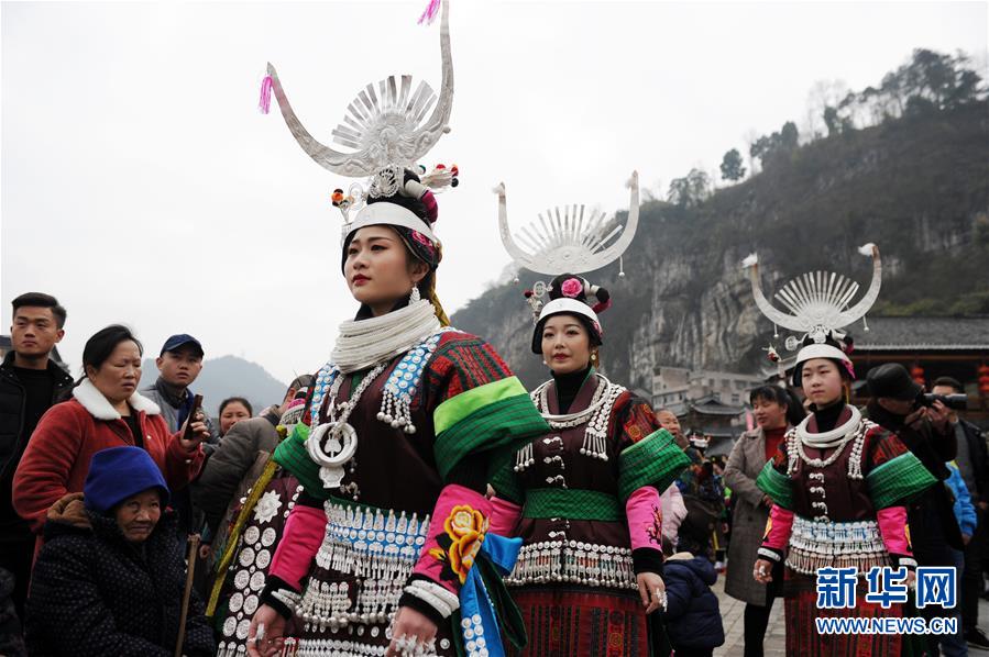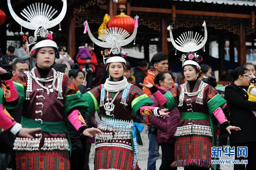 2月24日,在貴州省凱里市舟溪鎮,苗族姑娘身著盛裝跳蘆笙舞。 當日,在貴州省黔東南苗族侗族自治州凱里市舟溪鎮,來自各地的苗族群眾身著節日盛裝,歡聚在古老的“甘囊香”蘆笙堂,男子吹奏起蘆笙,姑娘和孩子們跳起蘆笙舞,歡度新春,祈求風調雨順、五谷豐登,青年男女也借此良日尋覓意中人。 “甘囊香”是苗語音譯,意思為“河流的下游,神仙匯聚的地方”。“甘囊香”蘆笙會是貴州規模最大、最古樸的苗族蘆笙會之一。 新華社記者楊文斌攝