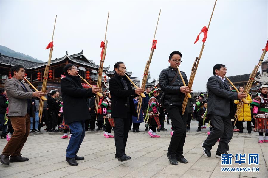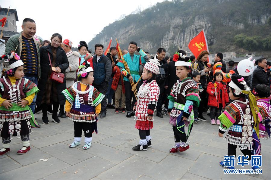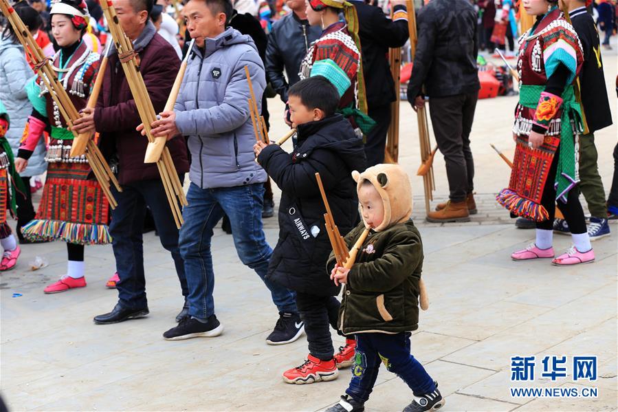 2月24日,在貴州省凱里市舟溪鎮,苗族小朋友在吹奏蘆笙。 當日,在貴州省黔東南苗族侗族自治州凱里市舟溪鎮,來自各地的苗族群眾身著節日盛裝,歡聚在古老的“甘囊香”蘆笙堂,男子吹奏起蘆笙,姑娘和孩子們跳起蘆笙舞,歡度新春,祈求風調雨順、五谷豐登,青年男女也借此良日尋覓意中人。 “甘囊香”是苗語音譯,意思為“河流的下游,神仙匯聚的地方”。“甘囊香”蘆笙會是貴州規模最大、最古樸的苗族蘆笙會之一。 新華社發(吳吉斌攝)