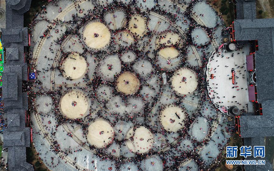 2月24日,在貴州省凱里市舟溪鎮,苗族群眾在跳蘆笙舞(無人機拍攝)。 當日,在貴州省黔東南苗族侗族自治州凱里市舟溪鎮,來自各地的苗族群眾身著節日盛裝,歡聚在古老的“甘囊香”蘆笙堂,男子吹奏起蘆笙,姑娘和孩子們跳起蘆笙舞,歡度新春,祈求風調雨順、五谷豐登,青年男女也借此良日尋覓意中人。 “甘囊香”是苗語音譯,意思為“河流的下游,神仙匯聚的地方”。“甘囊香”蘆笙會是貴州規模最大、最古樸的苗族蘆笙會之一。 新華社記者楊文斌攝