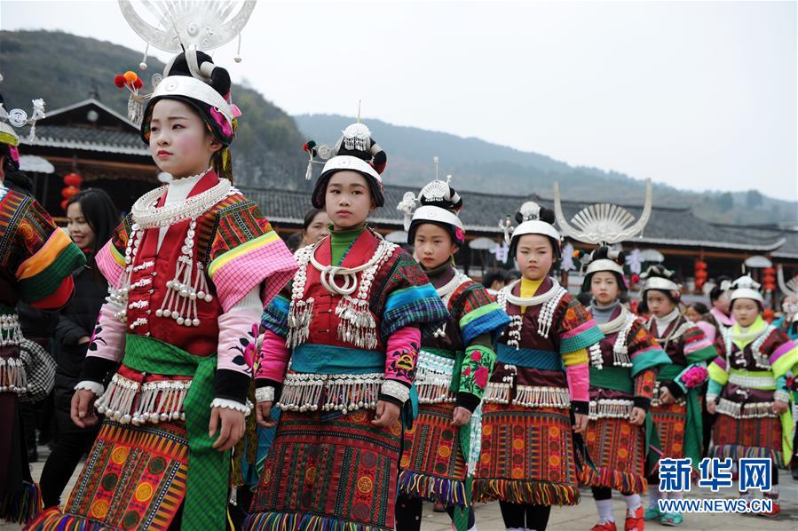 2月24日,在貴州省凱里市舟溪鎮,苗族小姑娘身著盛裝跳蘆笙舞。 當日,在貴州省黔東南苗族侗族自治州凱里市舟溪鎮,來自各地的苗族群眾身著節日盛裝,歡聚在古老的“甘囊香”蘆笙堂,男子吹奏起蘆笙,姑娘和孩子們跳起蘆笙舞,歡度新春,祈求風調雨順、五谷豐登,青年男女也借此良日尋覓意中人。 “甘囊香”是苗語音譯,意思為“河流的下游,神仙匯聚的地方”。“甘囊香”蘆笙會是貴州規模最大、最古樸的苗族蘆笙會之一。 新華社記者楊文斌攝