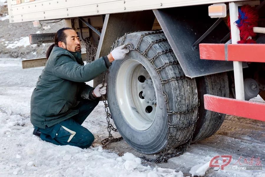 其美多吉出車前給輪胎安裝防滑鏈。 攝影 周兵