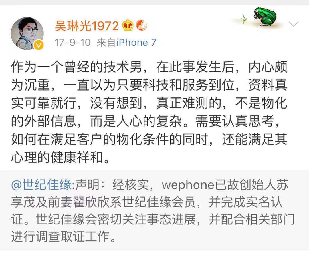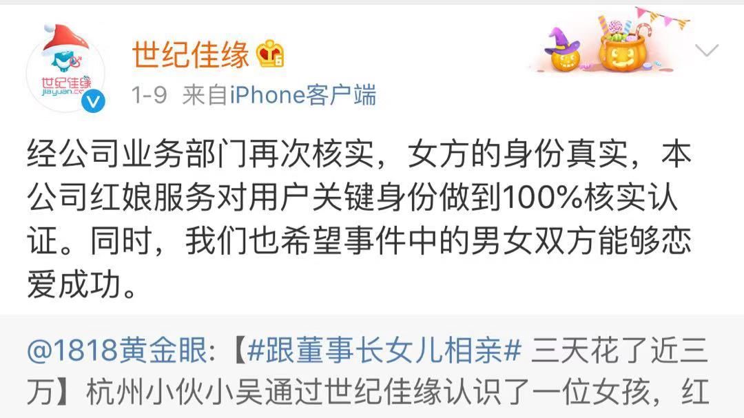 小吳向世紀(jì)佳緣提出質(zhì)疑,世紀(jì)佳緣曾通過(guò)官微回復(fù):女方的身份真實(shí)。