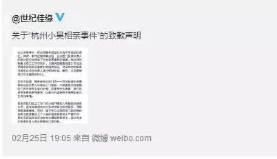 一個(gè)多月之后的2月25日,世紀(jì)佳緣在其官方微博發(fā)布《致歉聲明》。確認(rèn)相親女性提供虛假信息,決定對(duì)其提起訴訟,并按合同金額的三倍對(duì)吳先生進(jìn)行補(bǔ)償。